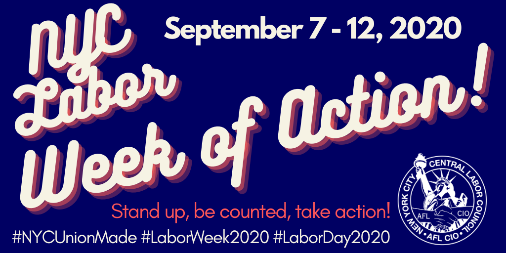 Monday, September 7 through Saturday, September 12: Join the NYC CLC, affiliates, and community partners as we engage in a week of action to support NYC workers. Our week of action will include civic engagement and work around upcoming elections, outreach in the final weeks of the 2020 census, and organizing workers to build the labor movement across our City. Click here for more info!