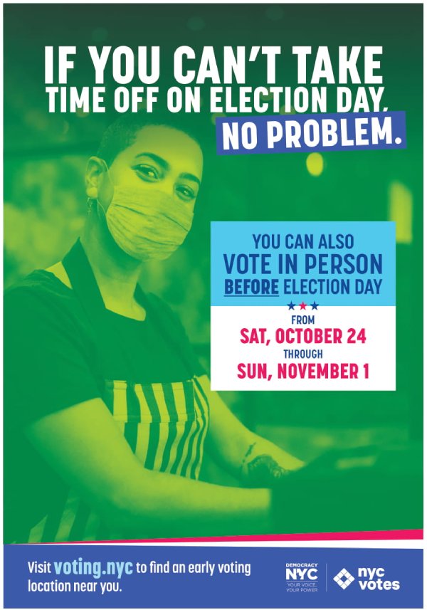Early voting happens 9 days in a row before the election and allows you to vote in-person on weekdays, weekends and evenings. Need a ride to your poll-site? Get $5 off your taxi ride when voting early, October 24 through November 1, with Curb. Use promo code “Vote Early.” Find your polling place at voting.nyc.